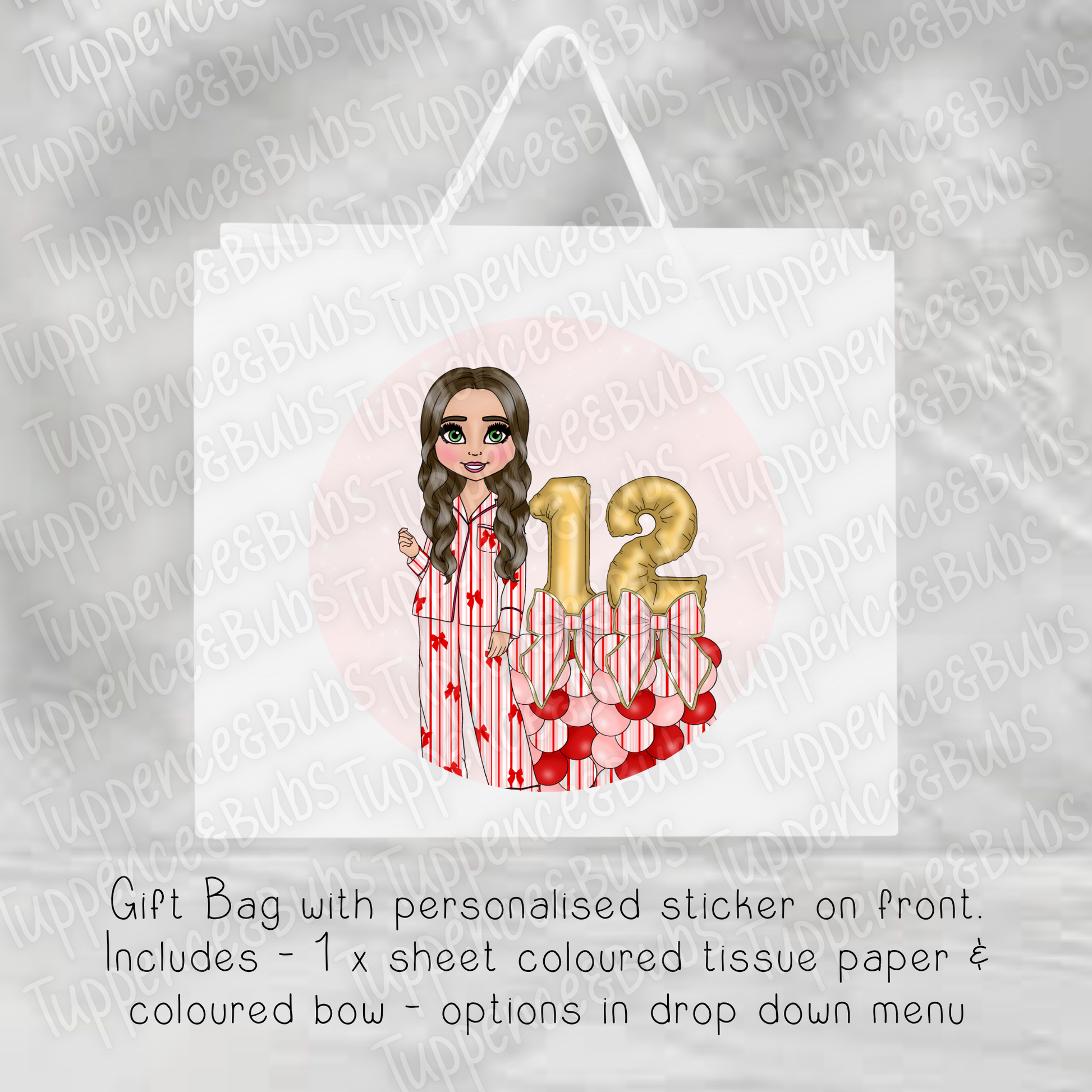 White Gift Bag comes with a personalised sticker on the front of the bag - 1 x sheet of tissue paper - a matching bow which you can place on the gift bag yourself.